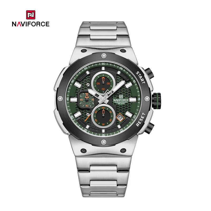 ساعة رجالية Navi Force 8072 براصلي فضي خلفية خضراءمقاوممة للماء و الصداء